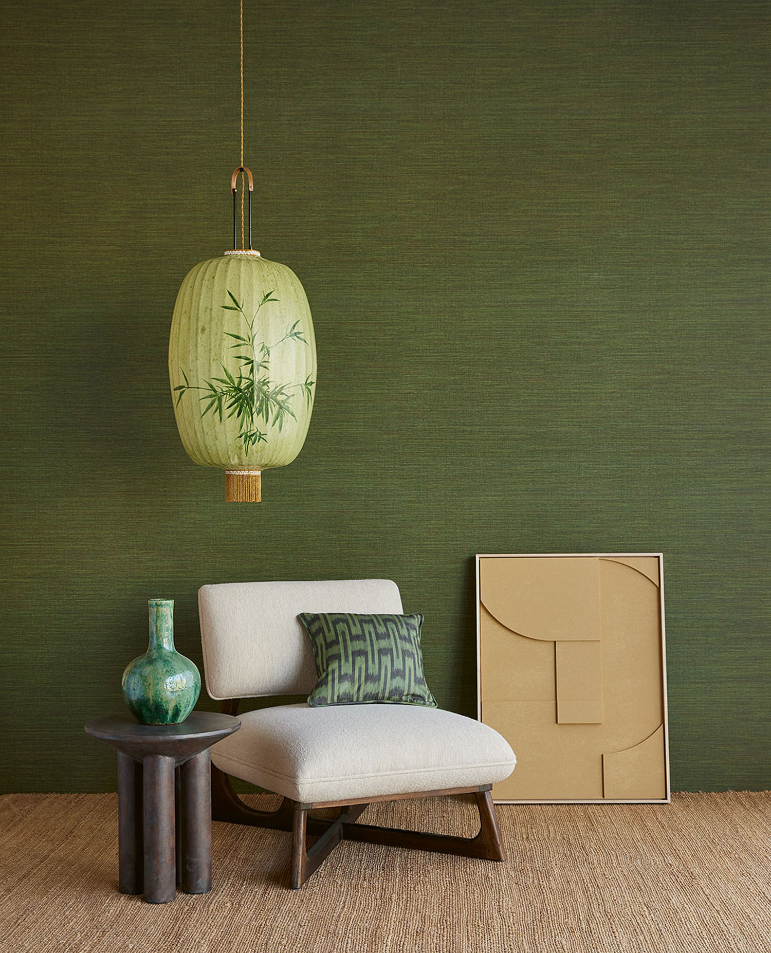 Vliesová tapeta s vinylovým povrchem, imitace hrubší tkaniny, melanž v odstínech zelené.