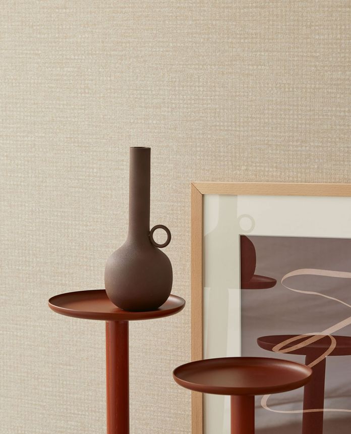 Krémová pololesklá vliesová tapeta na zeď, jemně plastický stříbřitý vzorek evokuje látkovou texturu.