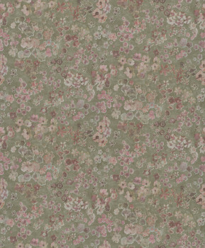 Zelená vliesová tapeta s vinylovým povrchem, vzor květin v odstínech růžové a fialové, hrubší látková textura.