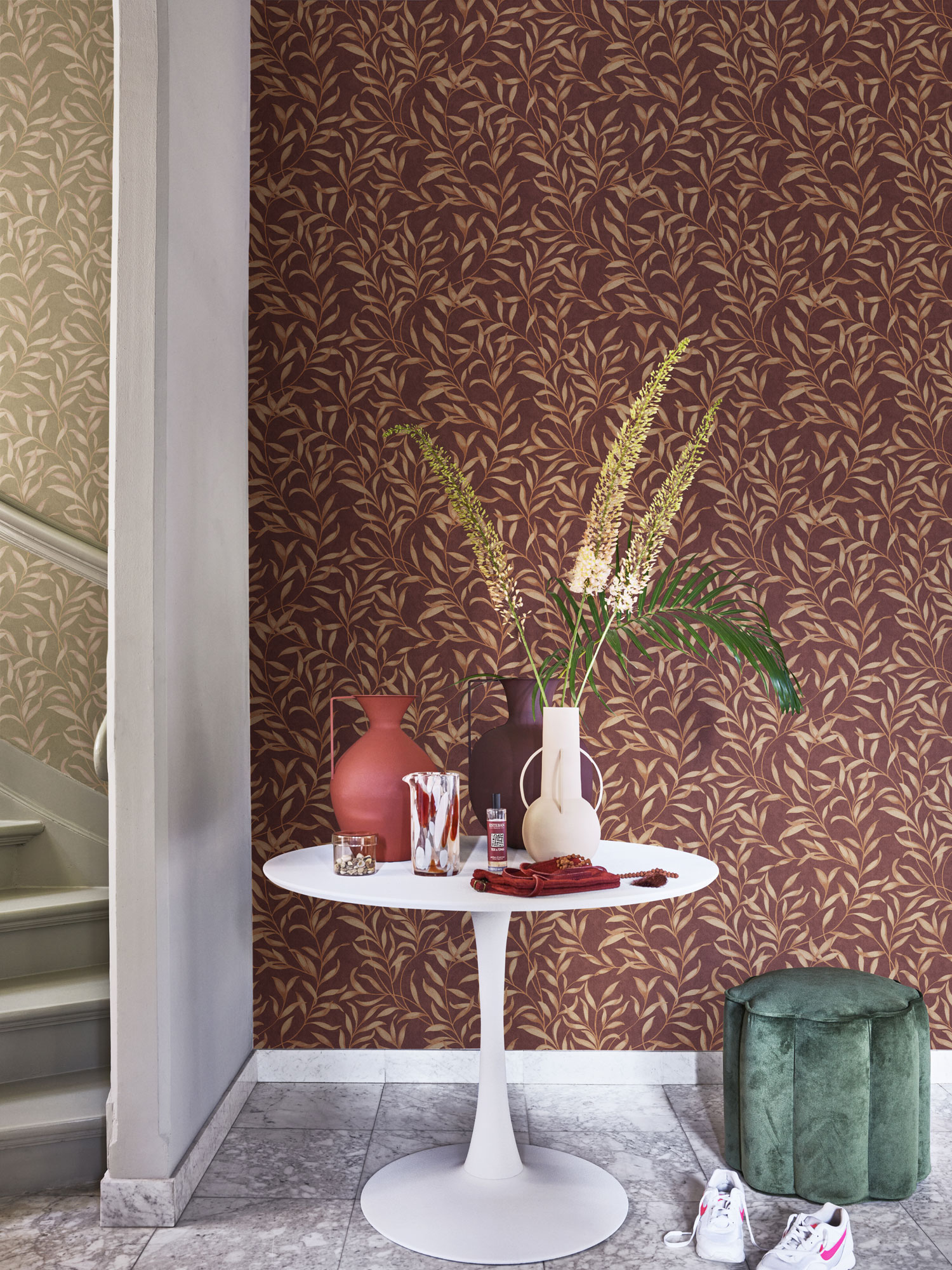 Hnědo-červená jemně strukturovaná vliesová tapeta s vinylovým povrchem, motivy větviček, listů, v odstínu terakota.
