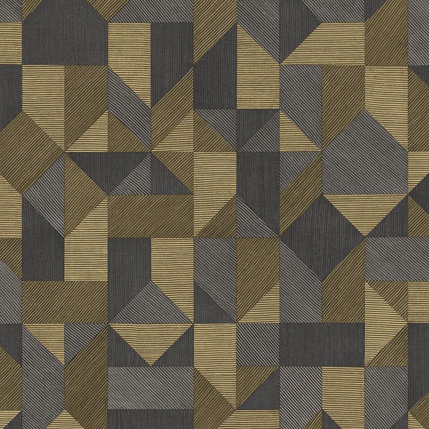 Vliesová tapeta. Vzor tvořený z čar v odstínech okrové a šedé.
