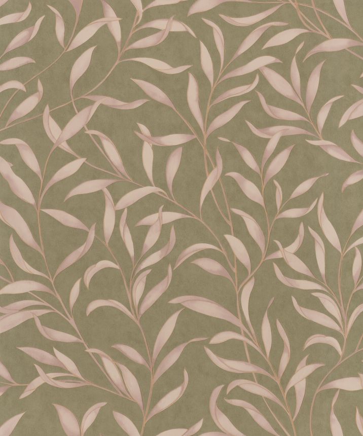 Zelená jemně strukturovaná vliesová tapeta s vinylovým povrchem, motivy větviček, listů, v růžových odstínech.