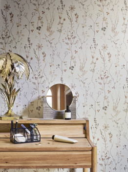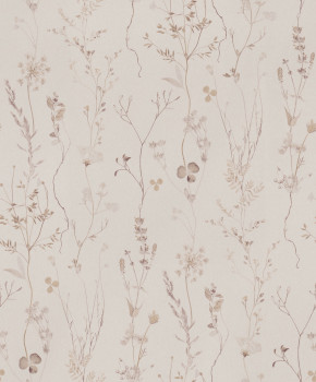 Béžová vliesová tapeta s vinylovým povrchem, vzor jemných lučních květin v odstínech fialové a hnědé.
