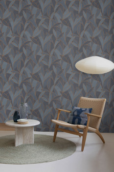 Modrá vliesová tapeta s vinylovým povrchem, motivy listů s bronzovými obrysy.