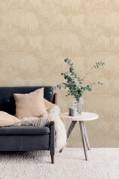 Béžová strukturovaná vliesová tapeta s vinylovým povrchem, motivy stromů, listů.