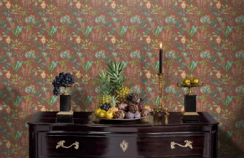 Vliesová tapeta. Podklad hnědo-červený, vzor odstíny zelené a oranžové, jemná látková textura.