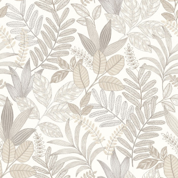 Šedo-béžová jemně strukturovaná vliesová tapeta s vinylovým povrchem, listy.