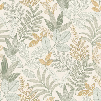Béžová, jemně strukturovaná vliesová tapeta s vinylovým povrchem, listy v odstínech zelené a hnědé.