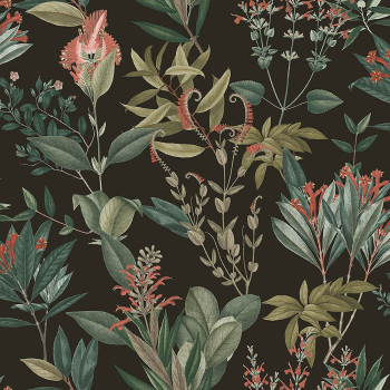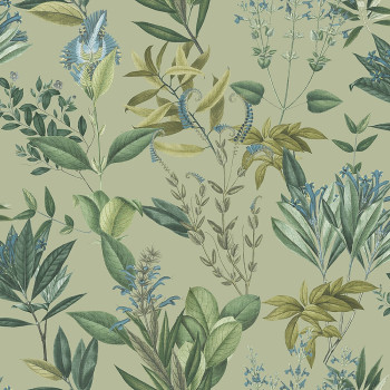 Vliesová tapeta. Podklad krémový, vzor zelená, okrová, starorůžová, jemná látková textura.
