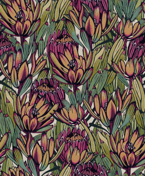 Hladká květinová vliesová tapeta na zeď, exotická květina protea a listy, odstíny oranžové, fialové, zelené a béžové. Foto interiéru je pouze ilustrační - odlišné barvy.