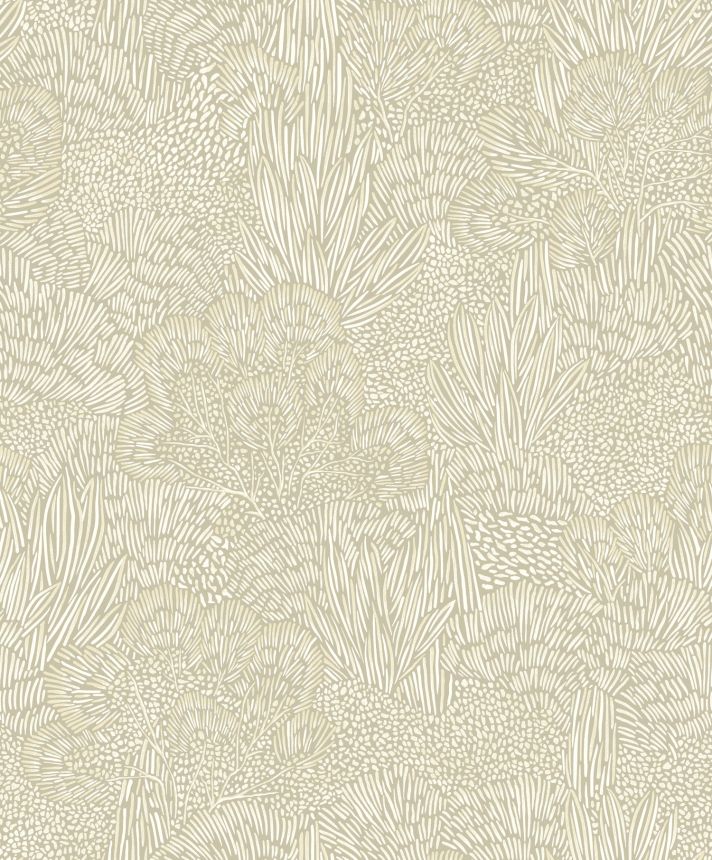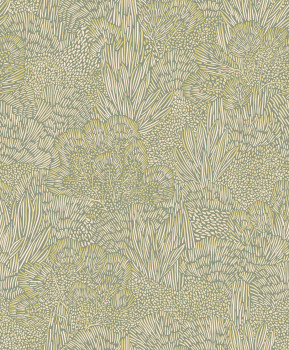 Jemně plastická šedo-béžová vliesová tapeta na zeď, pololesklé grafické motivy krajiny a stromů. Foto interiéru je pouze ilustrační - odlišné barvy.
