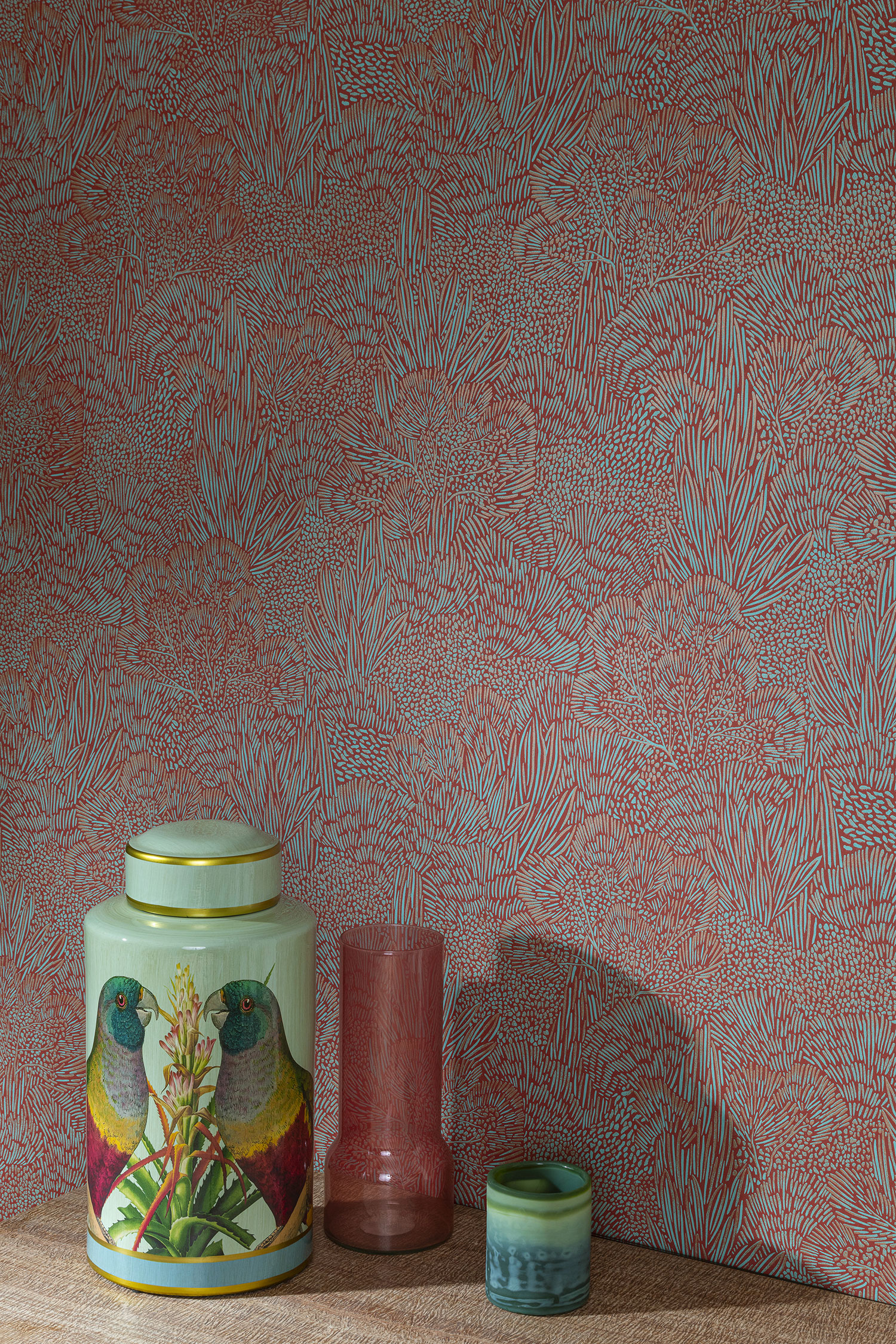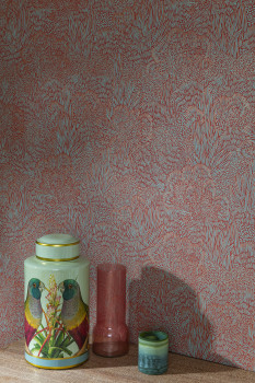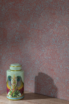 Jemně plastická červená vliesová tapeta na zeď, tyrkysové a metalické růžové grafické linie - motiv krajiny a stromů.