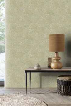 Jemně plastická zelená vliesová tapeta na zeď, béžové a zlaté grafické linie - motiv krajiny a stromů.