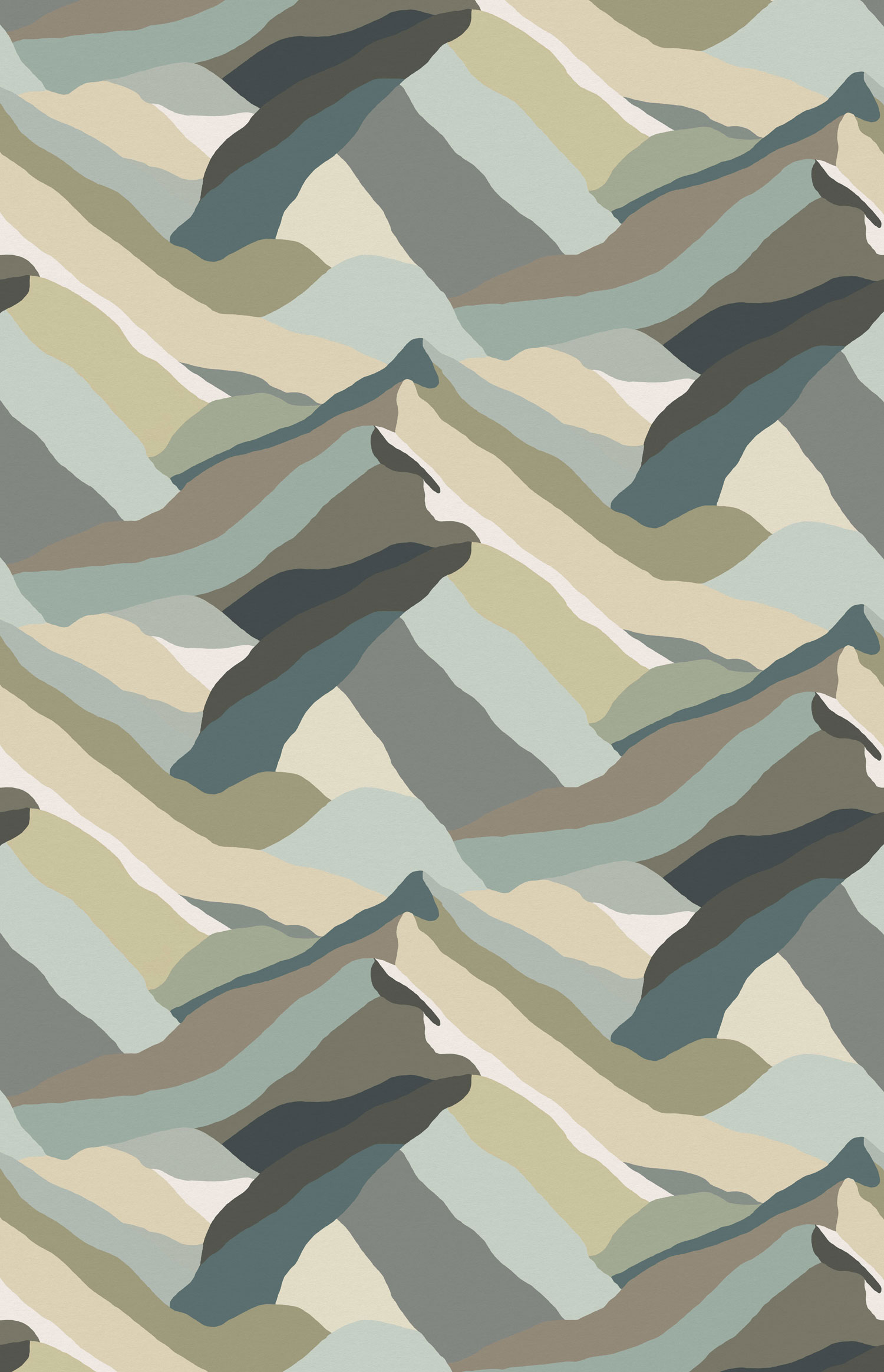 Netradiční obrazová vliesová tapeta s motivem krajiny, odstíny zelené, béžové, modré, šedé. 2 díly 90x280cm