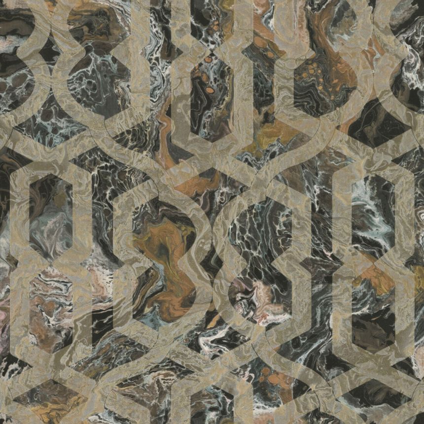 Luxusní vliesová tapeta s vinylovým povrchem - zlato-stříbrný geometrický vzor na mramorovaném hnědo-šedo-černém podkladu.