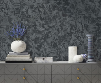 Luxusní vliesová tapeta s vinylovým povrchem - imitace zámeckého štuku, pololesklá plastická textura v odstínech černé.