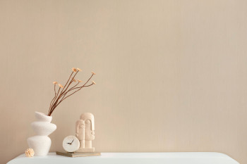 Luxusní vliesová tapeta s vinylovým povrchem -  plastická textura mačkané pololesklé krémové látky. Foto interiéru je pouze ilustrační - odlišné barvy.