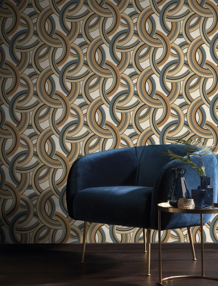 Vliesová, geometrická, 3D tapeta. Odstíny na tapetě jsou karamelové, modré, černé, zlaté.