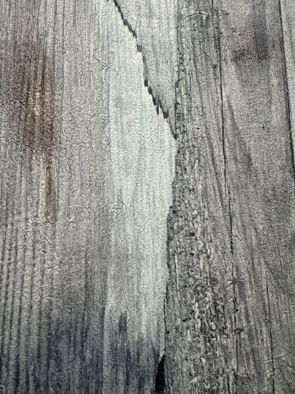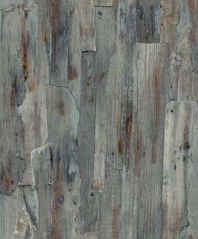 Vliesová tapeta na zeď imitující oprýskané dřevo, palubky v odstínech šedé a hnědé.