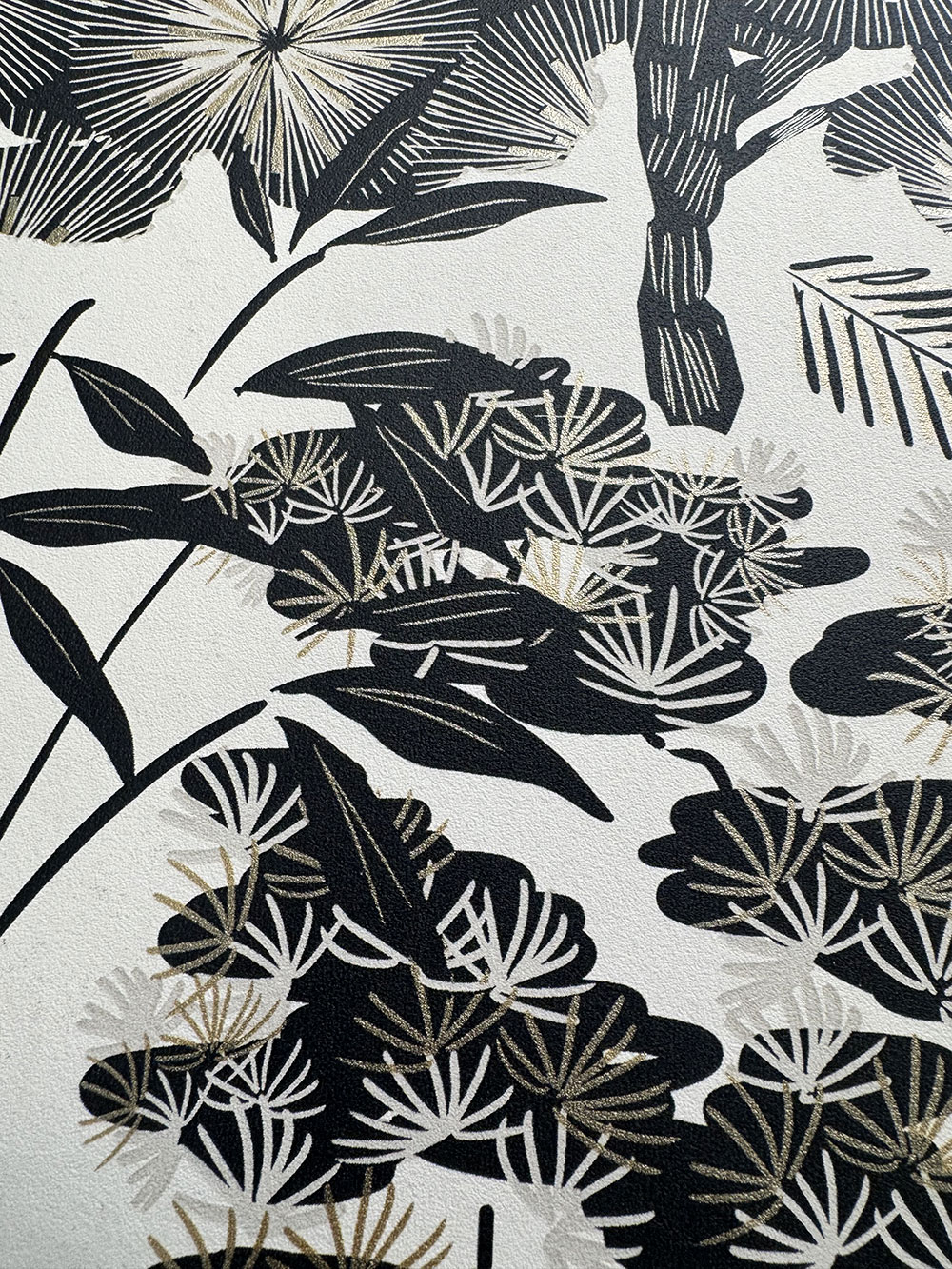 Béžová vliesová tapeta s květinami a listy v odstínech černé, béžové a jemně metalické zlaté. Foto interiéru je pouze ilustrační.