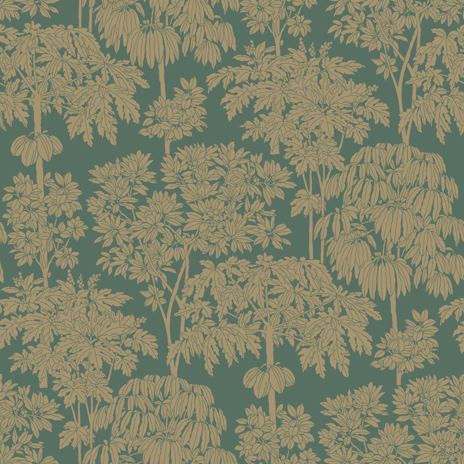 Zelená vliesová tapeta na zeď, zlaté stromy, listy.