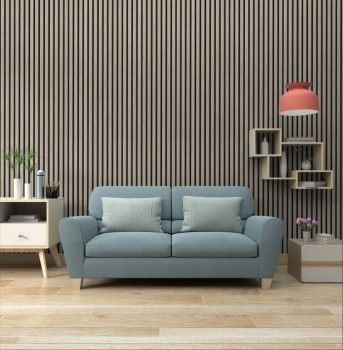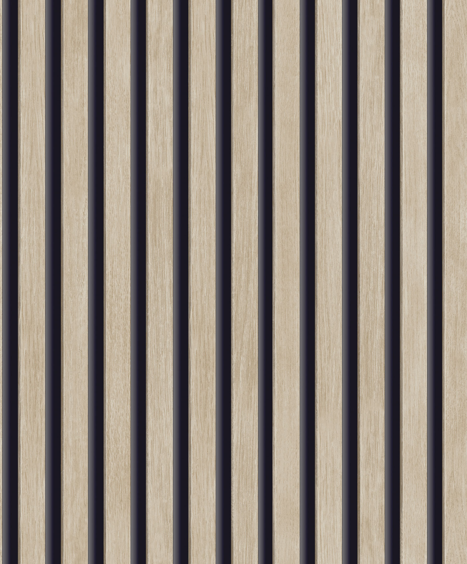 Kvalitní hnědo-béžová vliesová tapeta s vinylovým povrchem a jemným krupičkovým povrchem, která věrně imituje lamelový obklad na zeď.