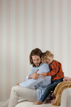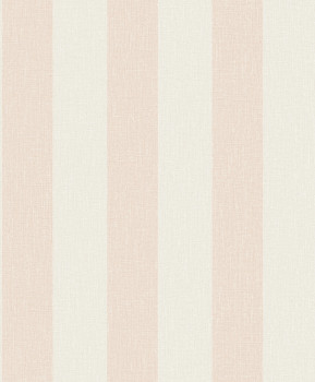 Světle růžová vliesová matná tapeta na zeď s béžovými pruhy, textura imitace látky.
