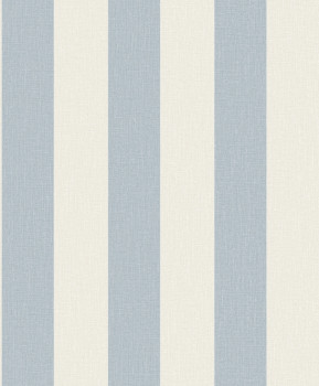 Světle modrá vliesová matná tapeta na zeď s béžovými pruhy, textura imitace látky.