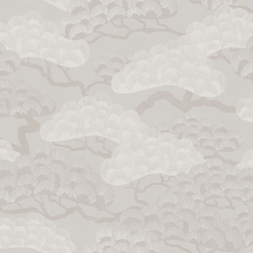Jemně plastická šedo-béžová vliesová tapeta s vinylovým povrchem, větvičky stromů.