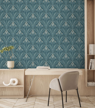 Jemně plastická zelená vliesová tapeta s vinylovým povrchem, květinový vzor ve stylu Art Deco.