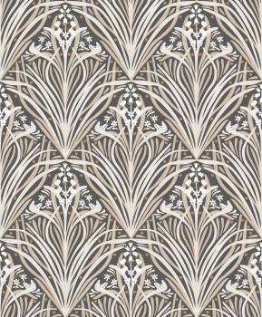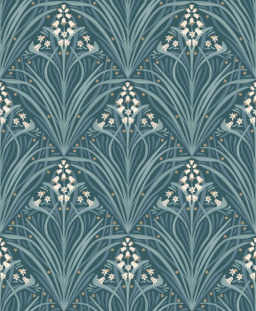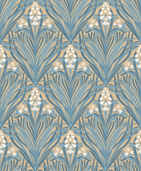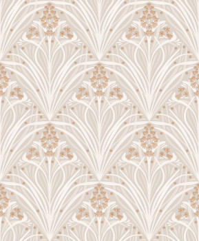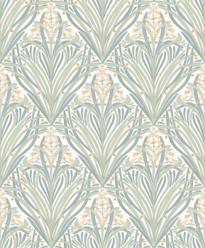 Jemně plastická krémová vliesová tapeta s vinylovým povrchem, béžový a zelený květinový vzor ve stylu Art Deco, pololesklé detaily.