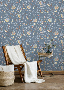 Modrá vliesová tapeta na zeď, motivy květin v odstínech modré, hnědé a okrové.