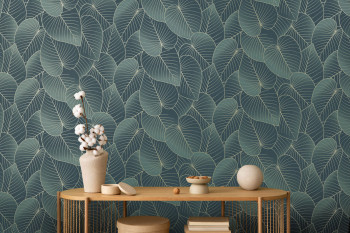 Zelená vliesová tapeta na zeď, zlaté obrysy listů.