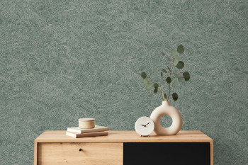 Omyvatelná vliesová tapeta s vinylovým povrchem, motivy listů, větviček, v odstínech zelené a pololesklé stříbrné.
