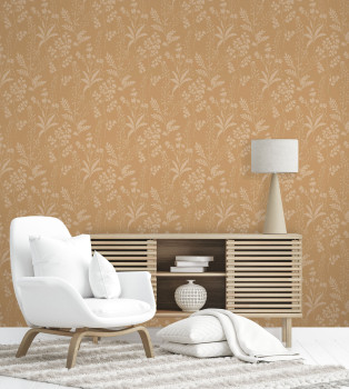 Jemně strukturovaná hnědá vliesová tapeta na zeď, hladké metalické béžové listy a květiny.