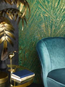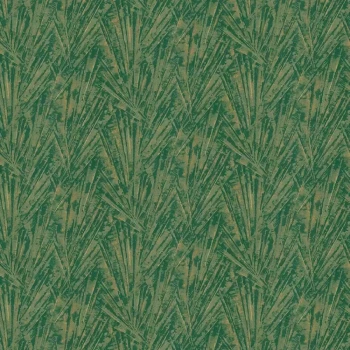 Luxusní vliesová tapeta na zeď - obrysy zlatých palmových listů na zeleném podkladu.