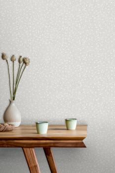 Jemně strukturovaná šedo-bílá vliesová tapeta na zeď - motivy větviček, pololesklé detaily.