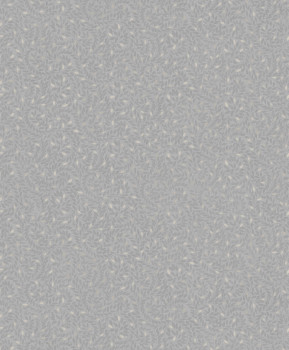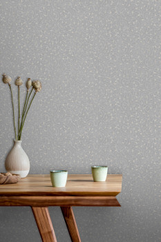 Jemně strukturovaná šedá vliesová tapeta na zeď - motivy větviček, pololesklé stříbřité detaily.