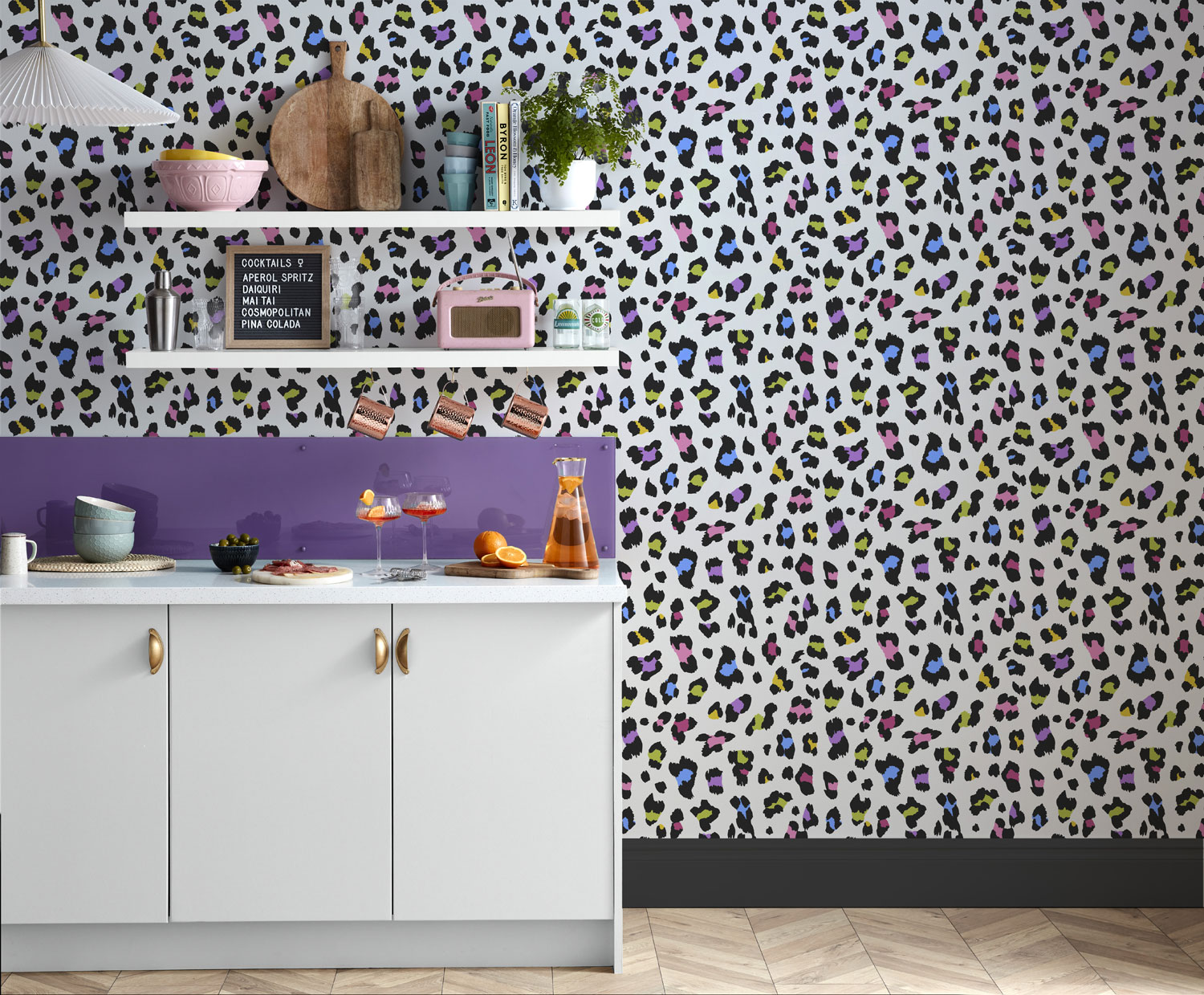 Hladká bílá vliesová tapeta na zeď, motiv leopardí kůže v netradičních barvách.