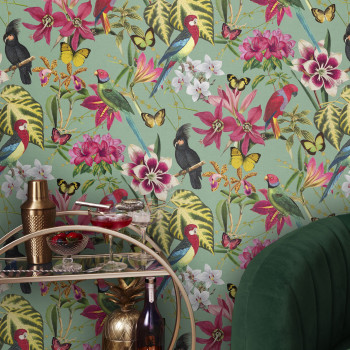 Hladká zelená vliesová tapeta na zeď, imitace látkové textury, květiny, papoušci a motýli v odstínech zelené, růžové a žluté.