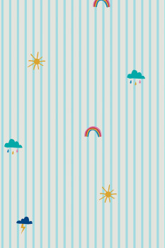 Tyrkysovo-bílá pruhovaná vliesová tapeta na zeď, motivy duhy, sluníčka a mráčků.