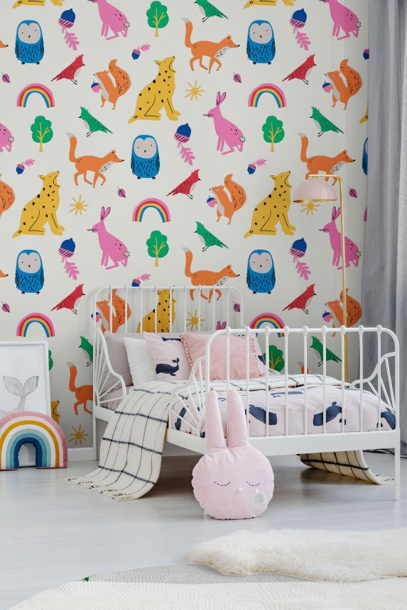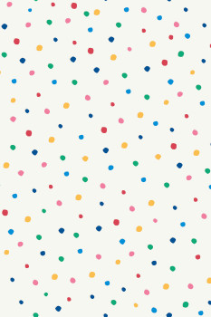 Bílá vliesová tapeta na zeď, barevné nepravidelné puntíky.