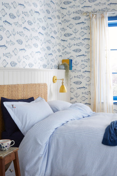 Bílá vliesová tapeta na zeď, modré motivy ryb.