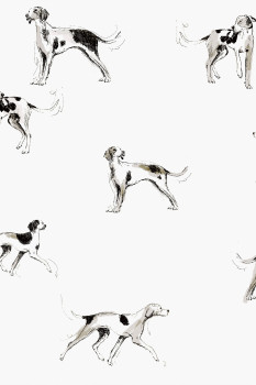 Bílá vliesová tapeta na zeď, motivy pejsků v odstínech šedé a černé.