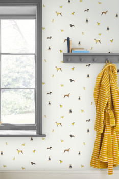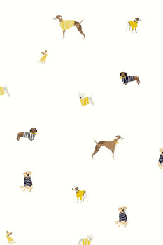 Krémová vliesová tapeta na zeď, motivy pejsků v odstínech okrové, hnědé, modré a šedé.