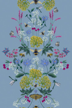 Modrá vliesová tapeta na zeď, motivy lučních květin, motýlů, vážek a včel.