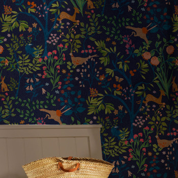 Temně modrá vliesová tapeta na zeď, větvičky, květiny, ptáci, zvířata.
