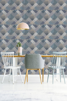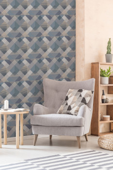 Vliesová tapeta na zeď, geometrický vzor v odstínech modré a šedé, linie v barvě světlého zlata.