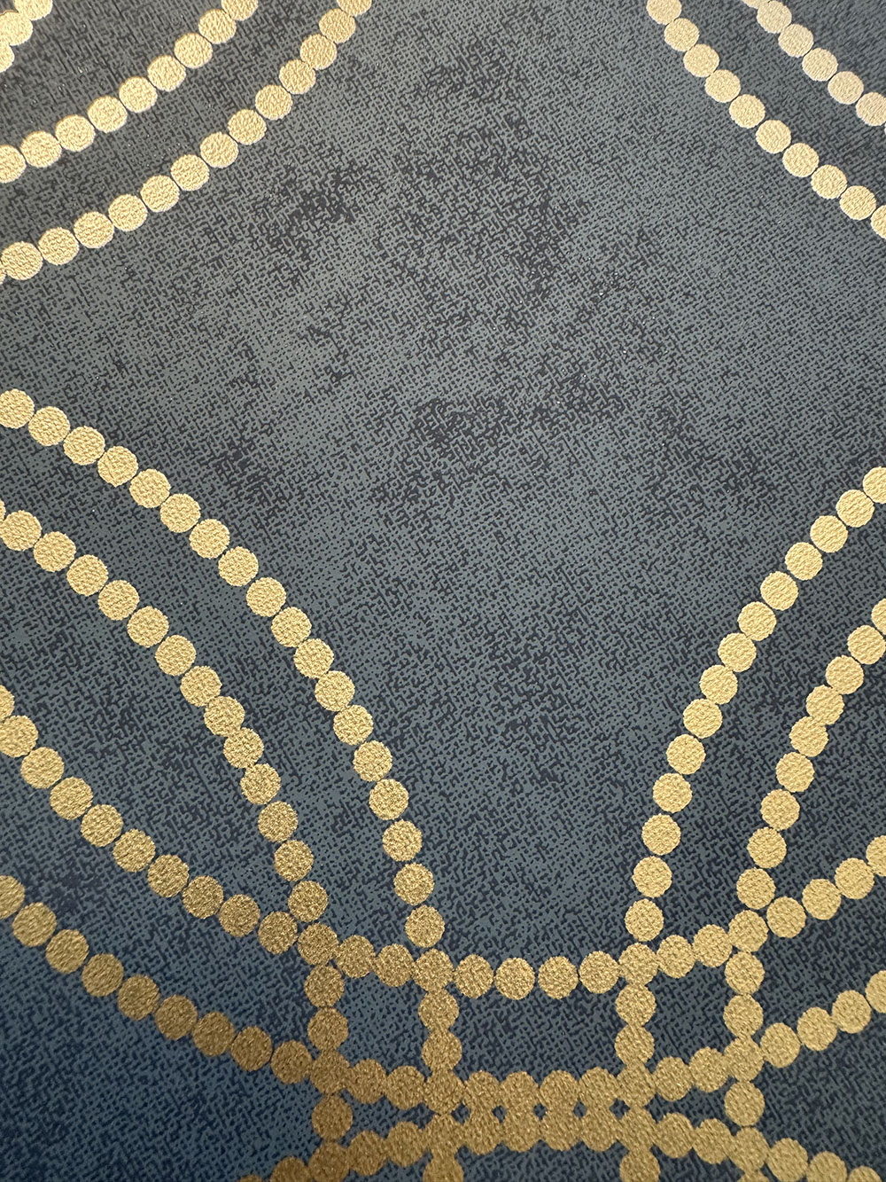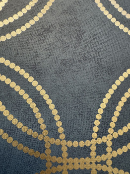 Hladká modrá vliesová tapeta se zlatým geometrickým vzorem.