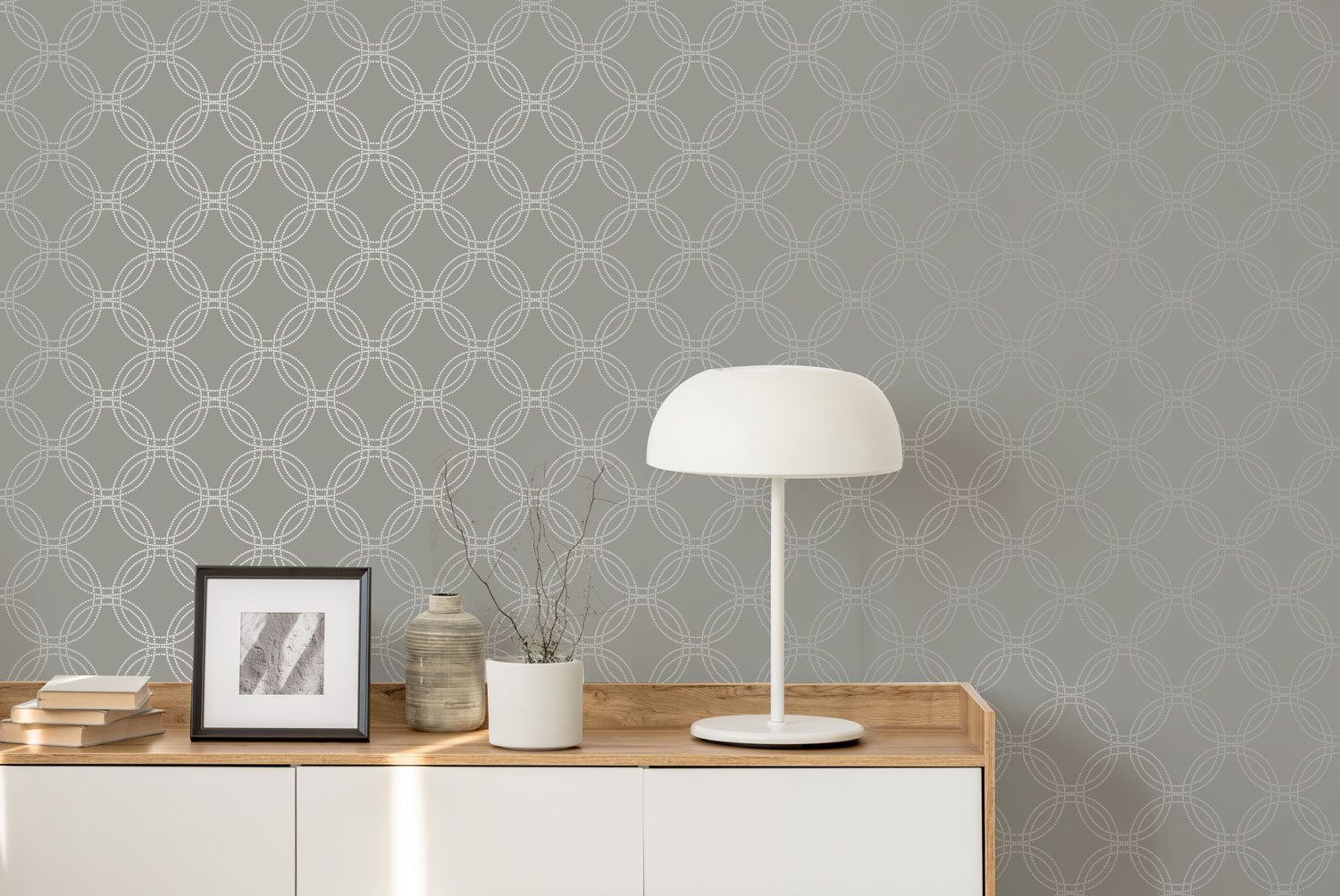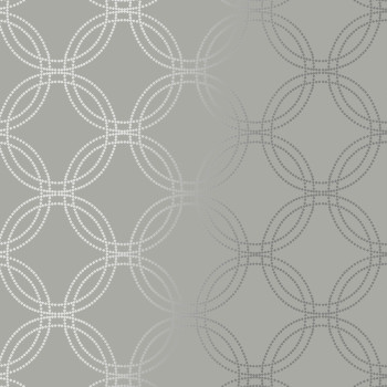 Hladká šedá vliesová tapeta se stříbrným geometrickým vzorem.